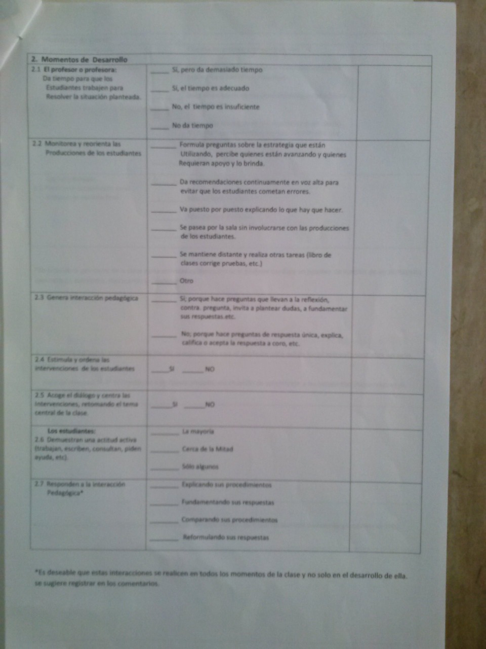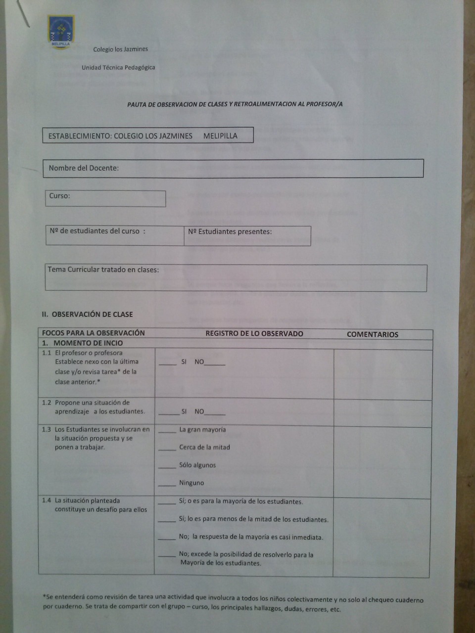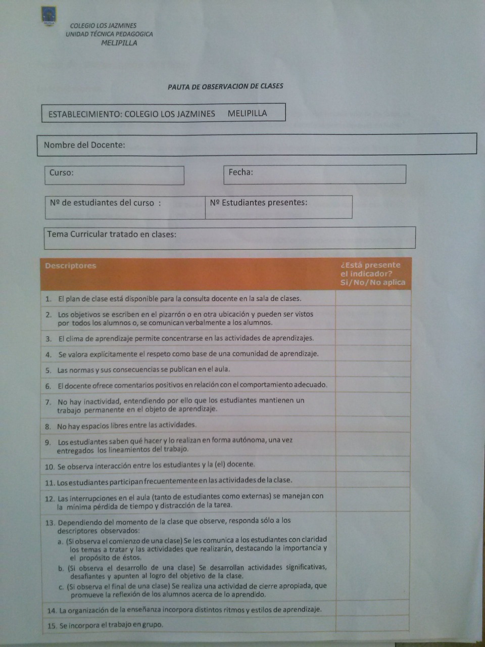 El centro educativo a través de la unidad técnica pedagógica elabora su propio instrumento de evaluación para identificar cuán bien es el trabajo de sus docentes en aula, y este instrumento es evaluado a través de una supervisión que realizan los jefe de U.T.P sin previo aviso en las aulas. A continuación se presenta el instrumento de evaluación: